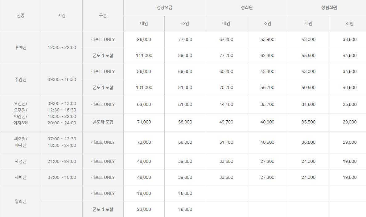 - 스키 리프트권: 주중 25%, 주말 20%할인
