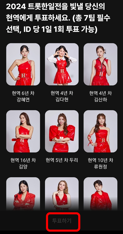 응원하는 현역 7팀을 선택하신 후 투표하기를 누릅니다