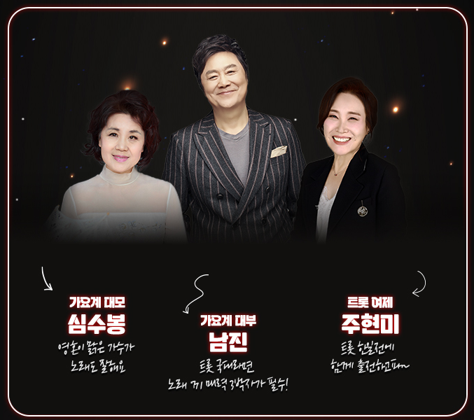 ✔심사위원 :신동엽, 심수봉, 남진, 주현미, 신유, 박현빈, 손태진 ,신성, 윤명선, 대성, 이지혜