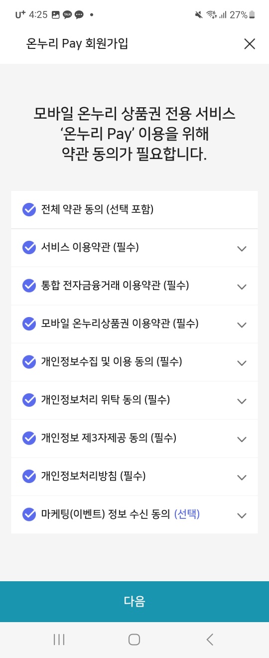 온누리 상품권 앱 다운로드 >본인인증 및 회원가입 >카드 등록 > 계좌관리 탭 >출금계좌 등록 >충전